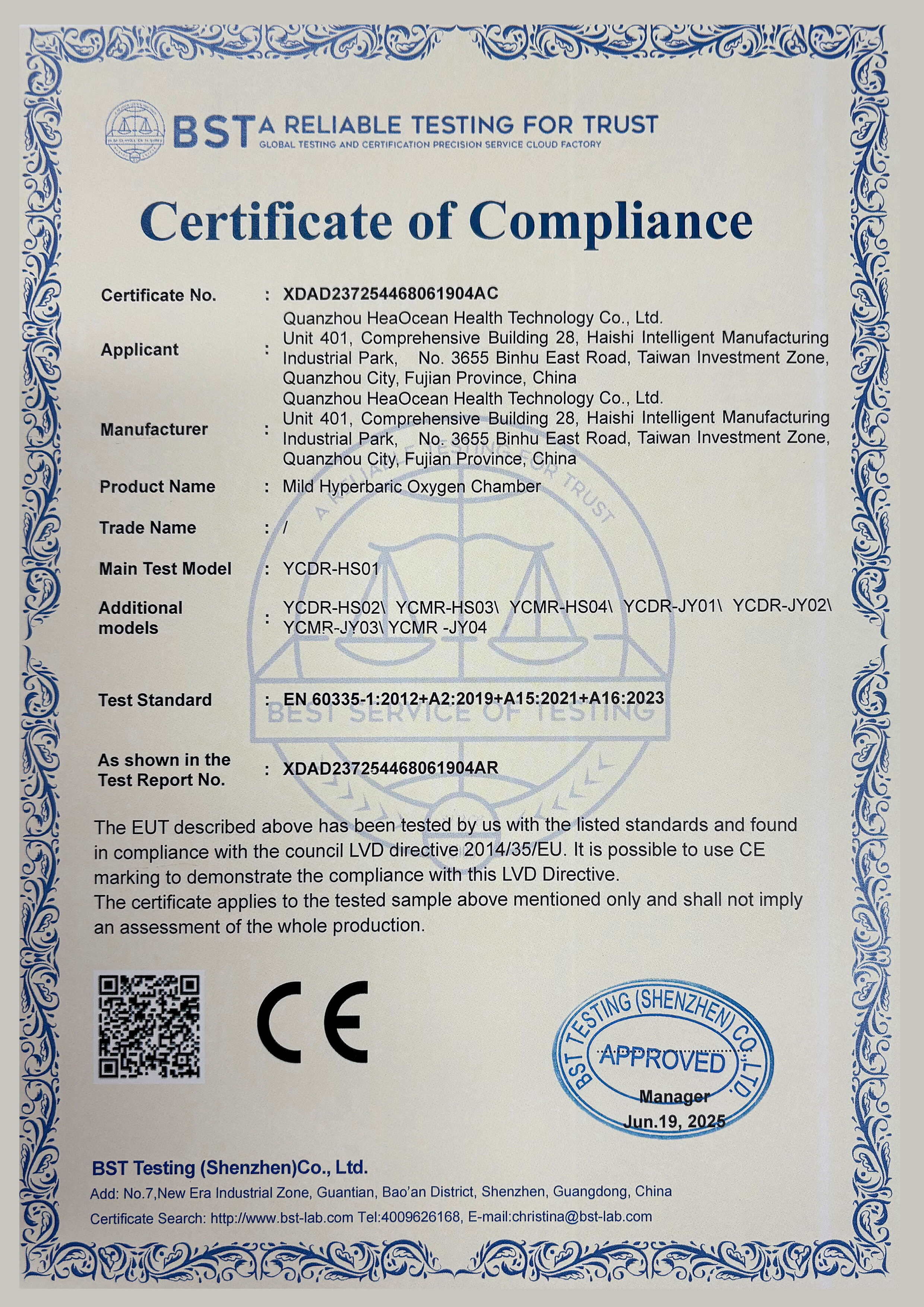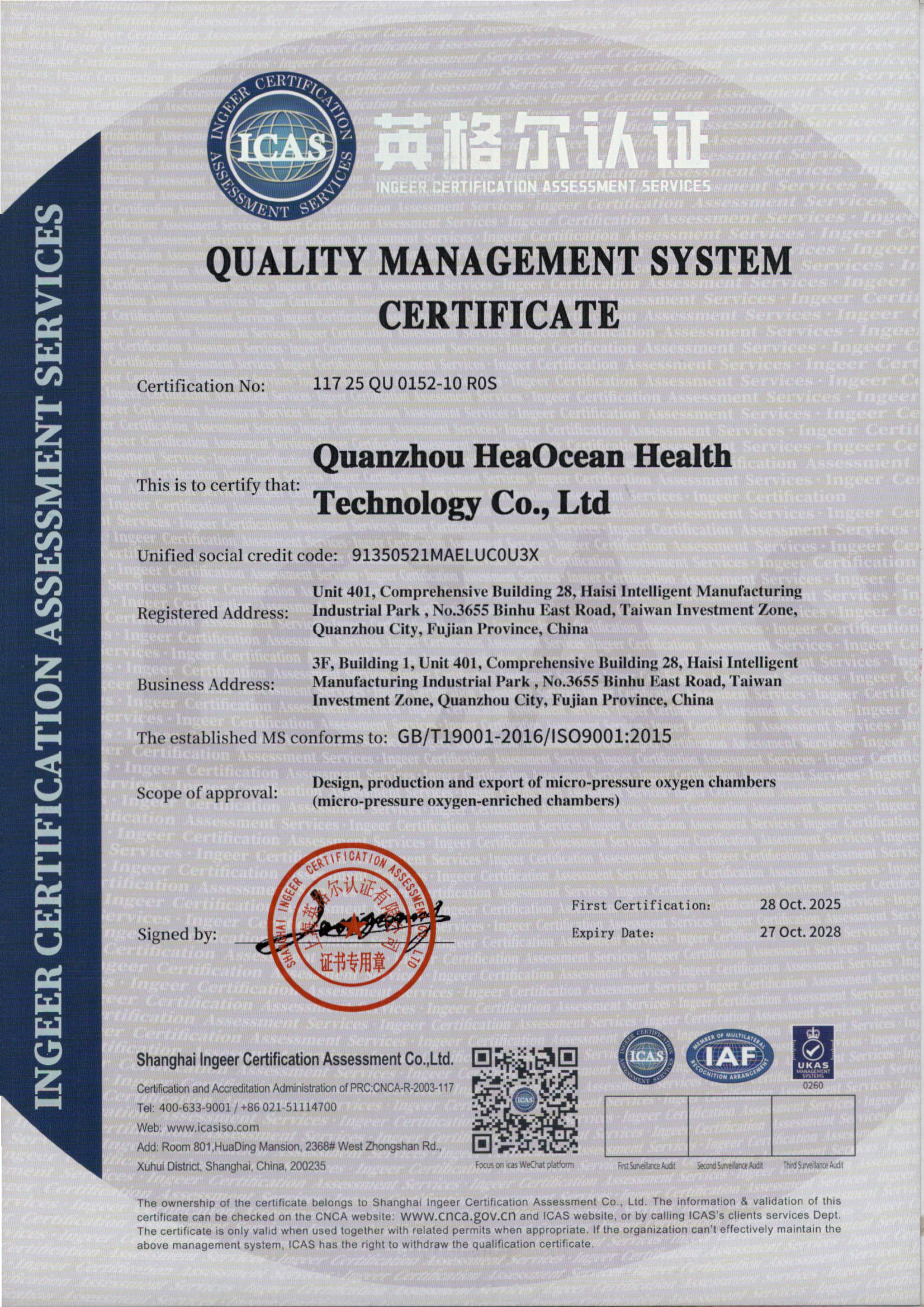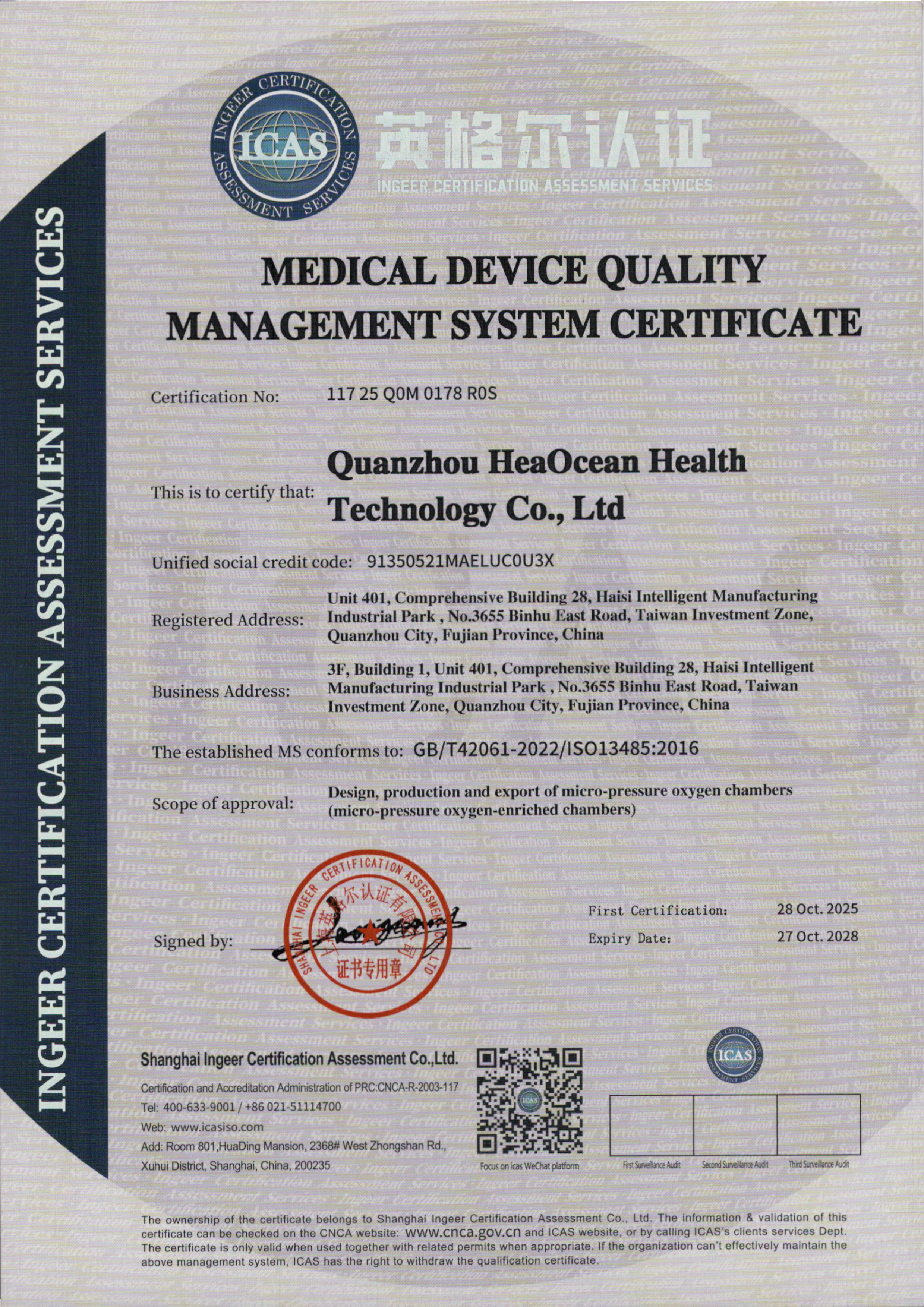 专业制造,品质认证:作为家用微压氧舱的专业制造商,我们已全面通过 IS09001质量管理体系与 IS013485 医疗器械质量管理体系认证。从研发、设计到生产,我们建立了全链路的精密品控体系,确保产品符合国际高标准。