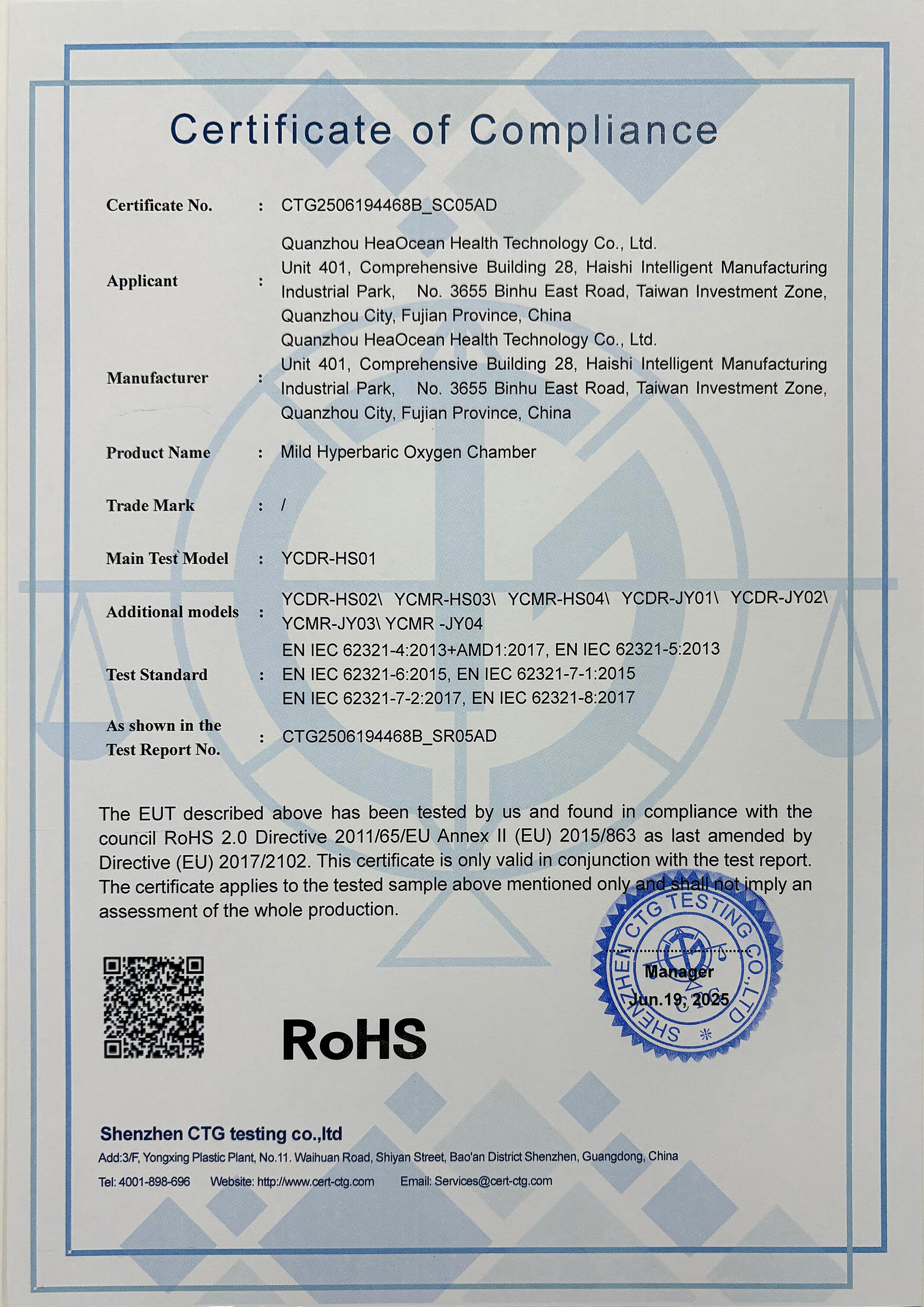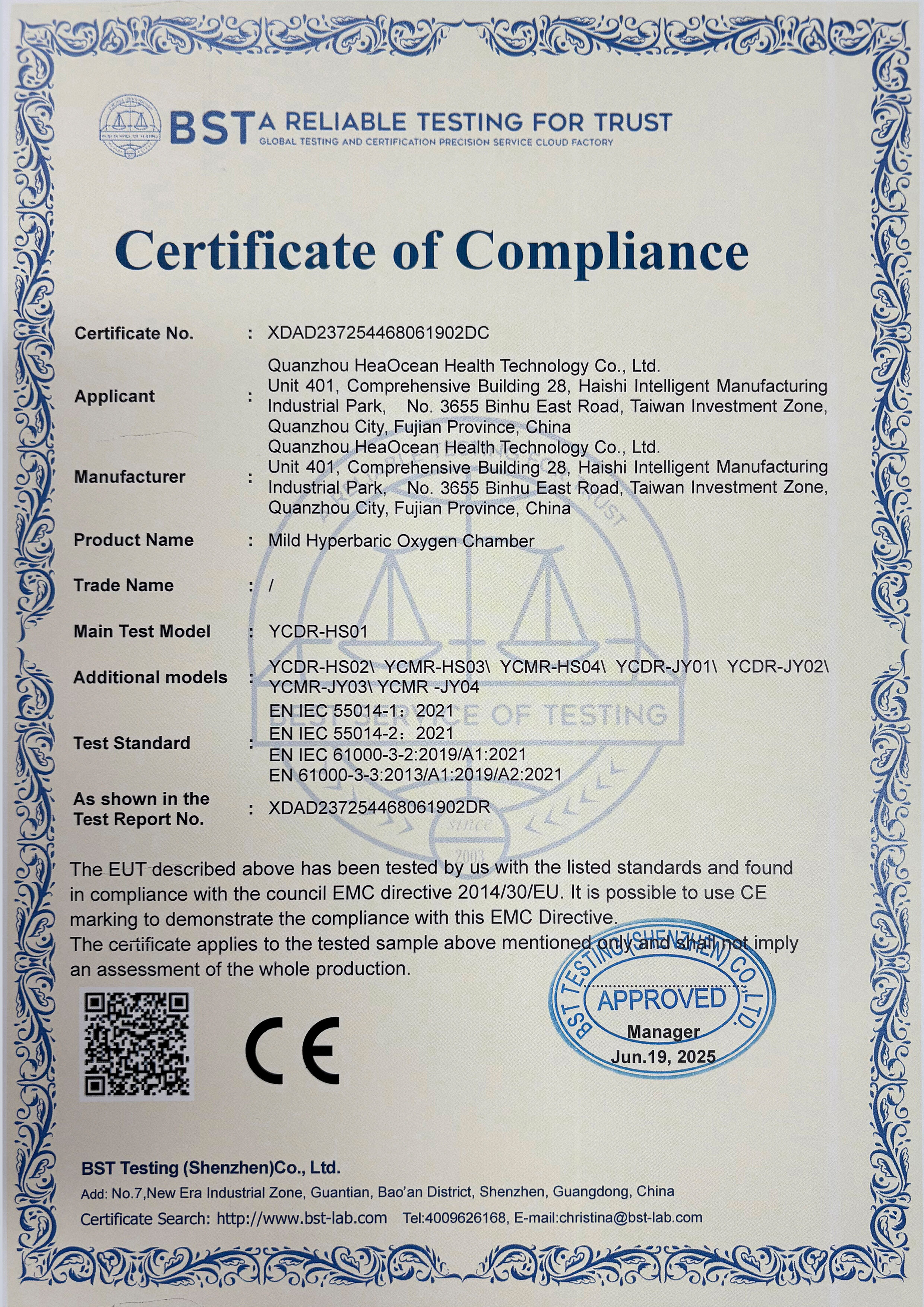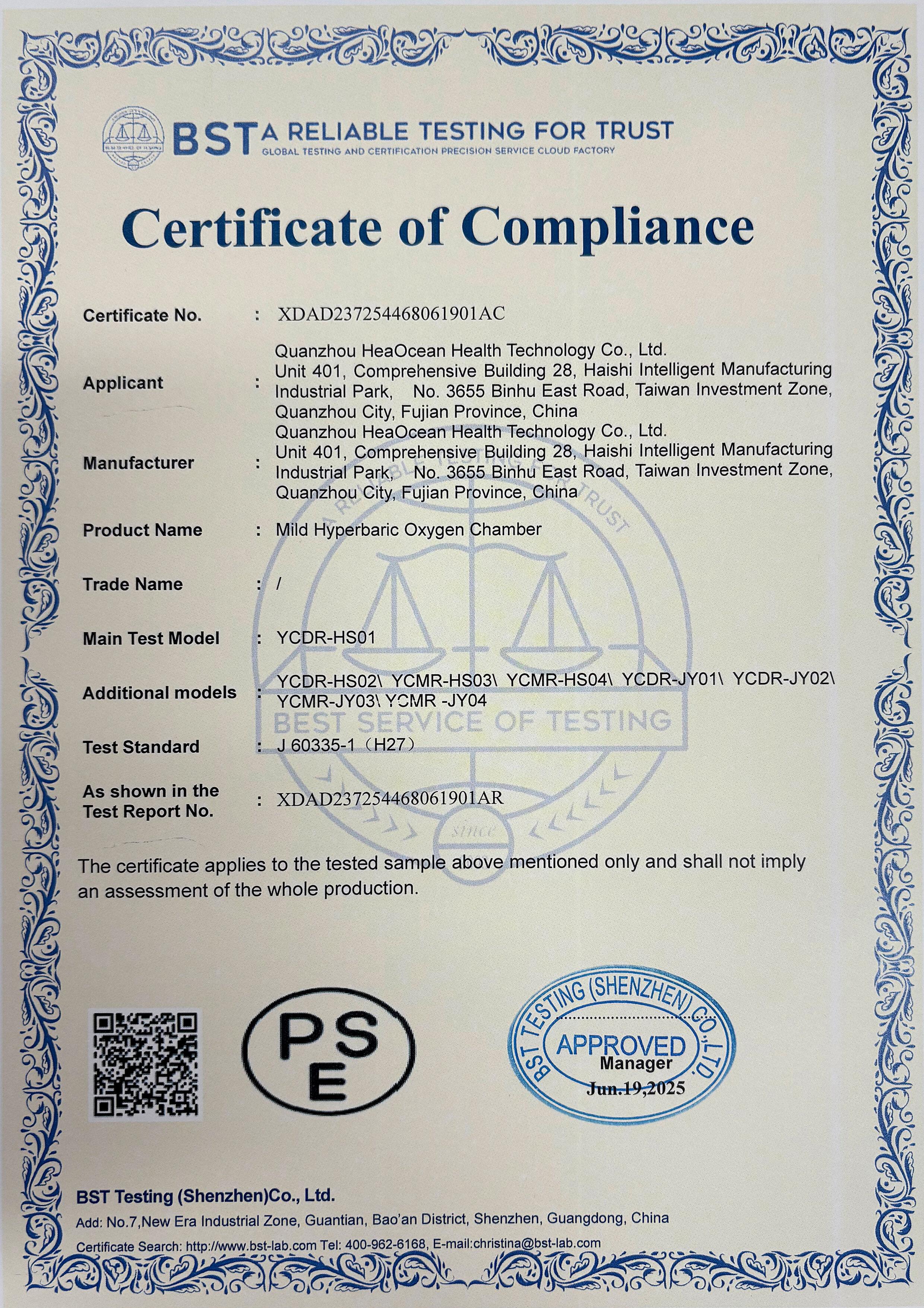 专业制造,品质认证:作为家用微压氧舱的专业制造商,我们已全面通过 IS09001质量管理体系与 IS013485 医疗器械质量管理体系认证。从研发、设计到生产,我们建立了全链路的精密品控体系,确保产品符合国际高标准。